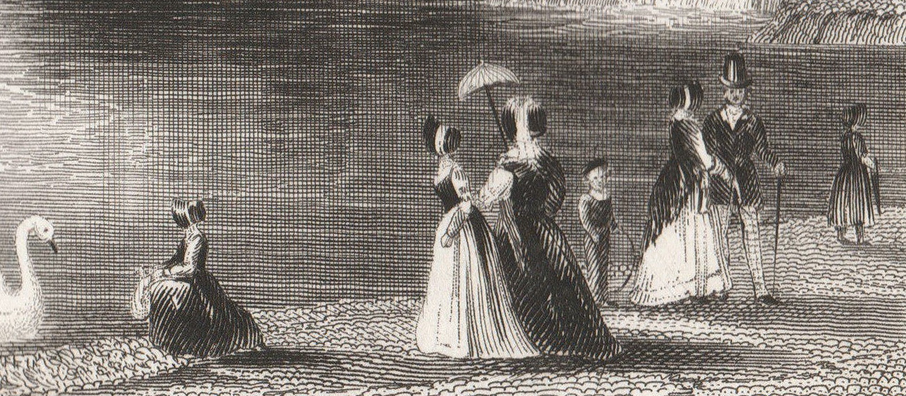 das Säckchen, dass sie sichtbar in Hüfthöhe am Gürtel befestigt hat, fallen auf. Der capeartige Umhang, die Pelerine ist um 1840 ein Accessoire der gut betuchten Frau. Den Beutel zeigt die modebewusste und wohlhabende Dame in der Funktion der heutigen Handtasche.