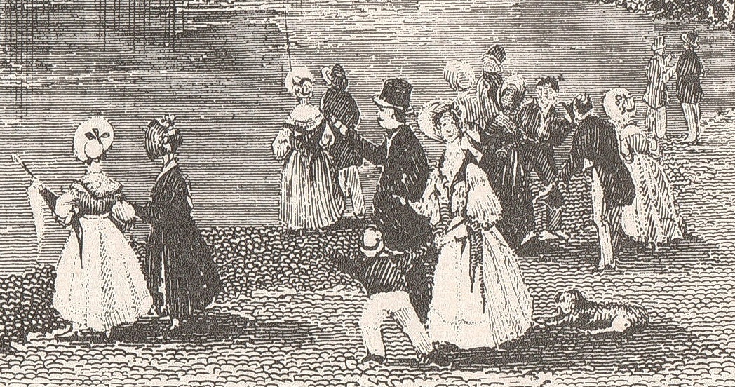 für in den Zeitgeist passende Konstellationen, also die Figuration und den Habitus von Personengruppen. Für diese Einschätzung spricht eine weitere Beobachtung. Der Zeichner hat drei andere Paare leicht nach vorn geneigt dargestellt, die beiden Damen links im Bild, das eng beisammen stehende Paar am Teichrand sowie ein Paar daneben, fast verdeckt von einer Gruppe. Diese erfassen wir erst auf den zweiten Blick, weil alle Personen hier ungewöhnlich dicht beieinander stehen. In der Vergrößerung der Grafik sind zwei Paare in einer Handlung vertieft zu erkennen, die vier Figurinen stellen eine eigene Szenerie dar: begrüßen, verneigen, angeregt miteinander reden. Sich zu unterhalten ist ebenso den beiden Herren wichtig, die der Zeichner an den rechten Rand gesetzt hat.