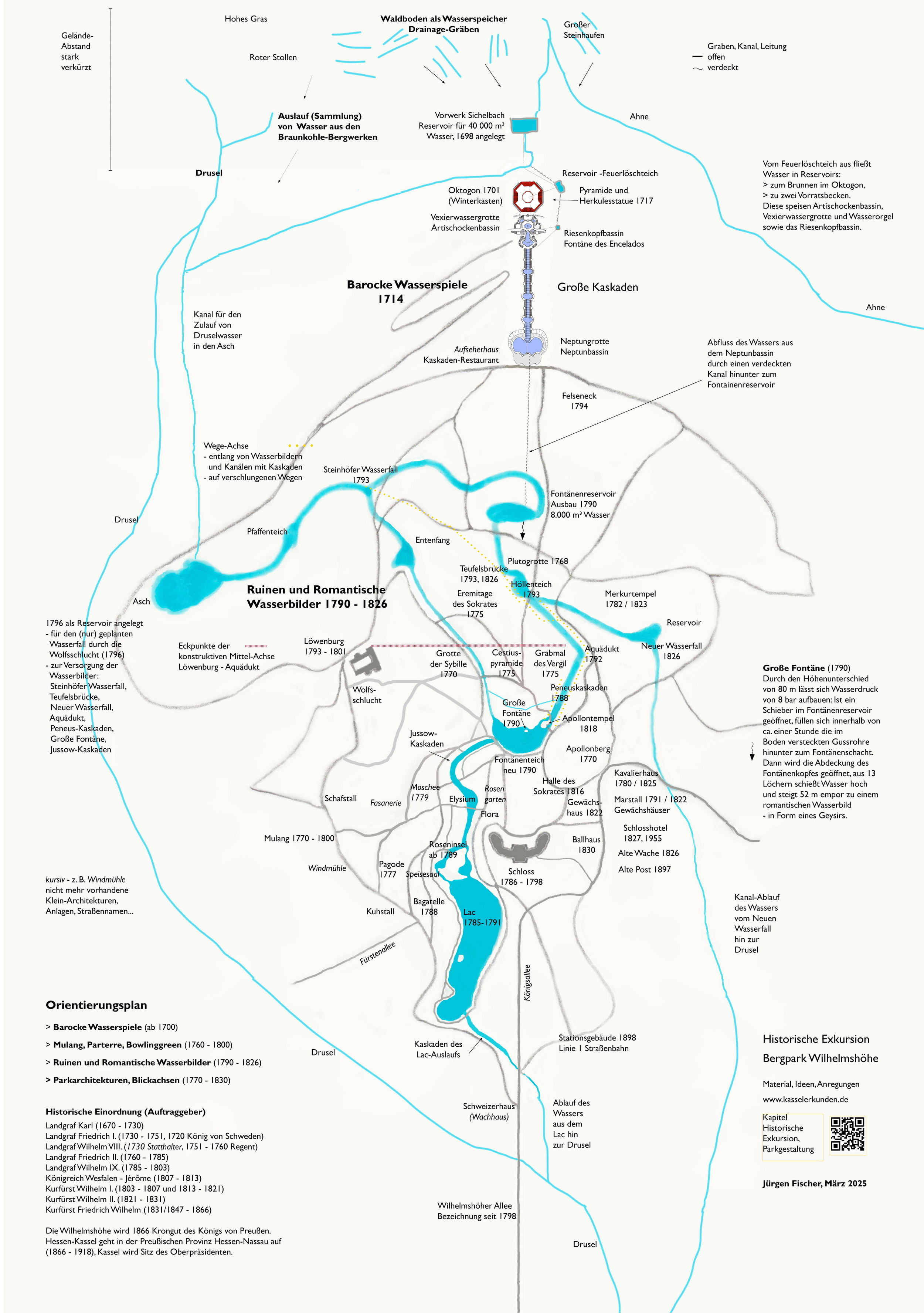 > Die Einstimmung auf eine Exkursion im reduzierten Blick auf die Dreiteilung: ...1) Große Kaskade, 2) Wasserkunst in der Mitte, 3) Große Fontäne am Bowlinggreen.